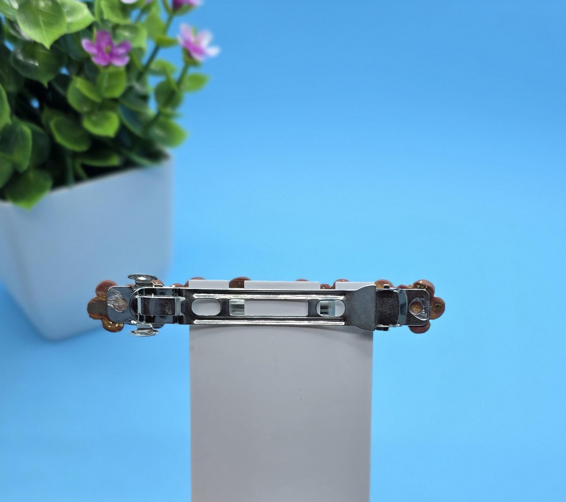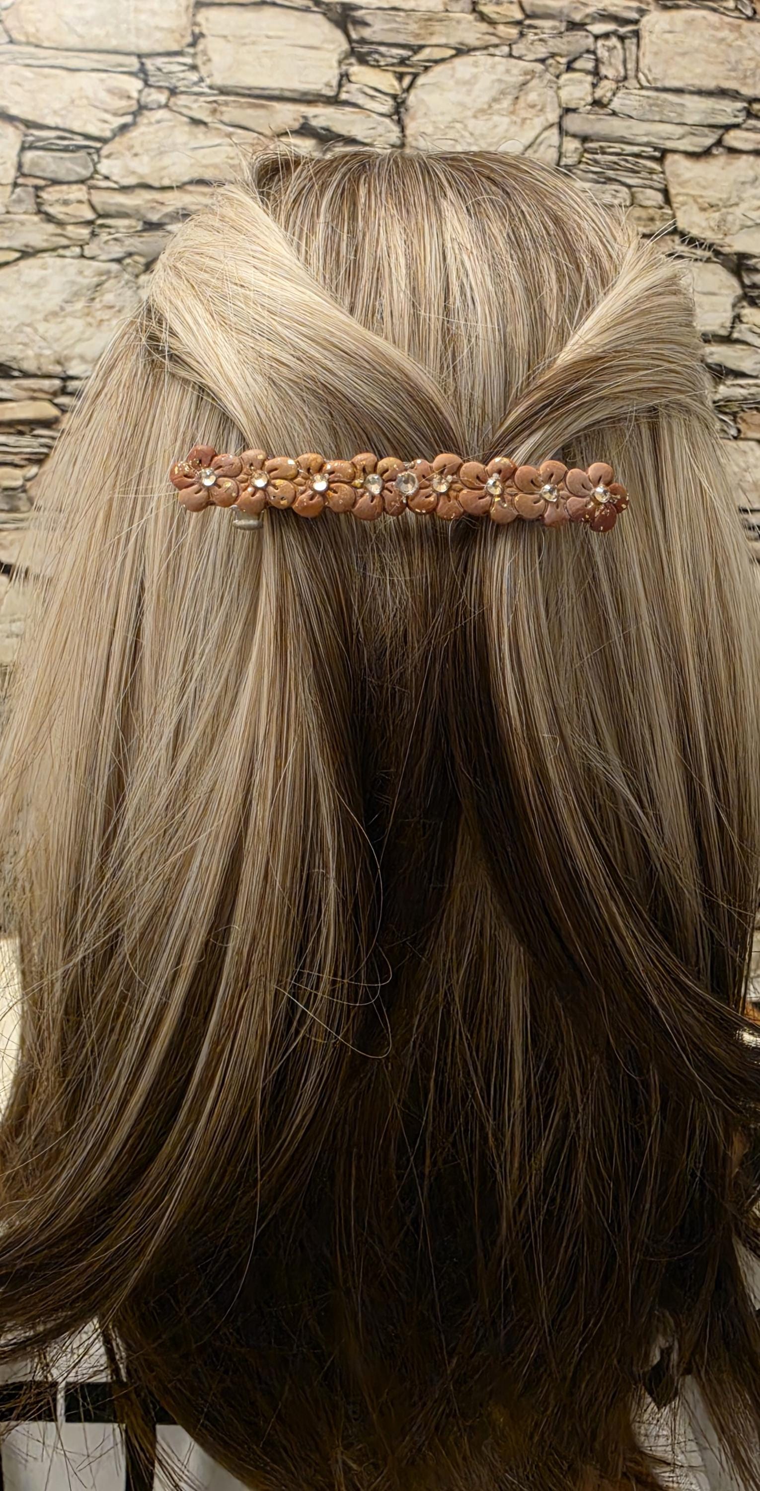 šø Who says neutrals canāt sparkle? This elegant French-style barrette is proof that subtle can still steal the show. Mold-sculpted flower blossoms in earthy blush, peach, and clay hues are each topped with a pale champagne rhinestoneājust enough shimmer to catch the light without trying too hard.
