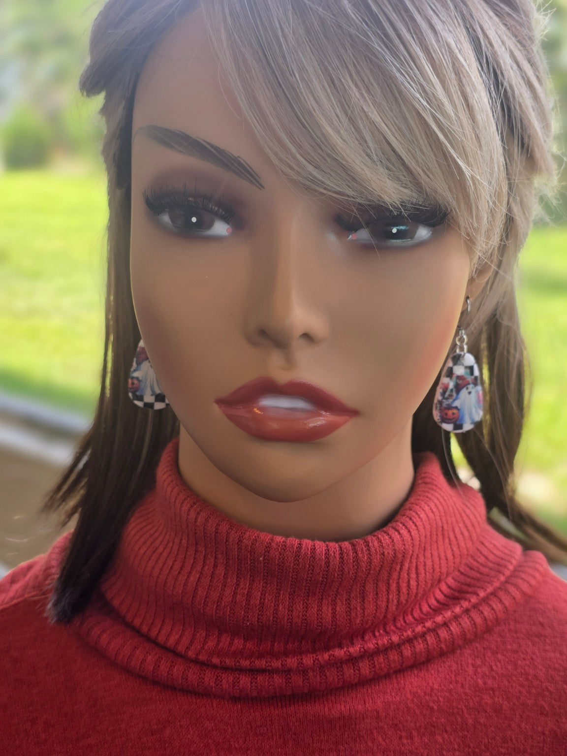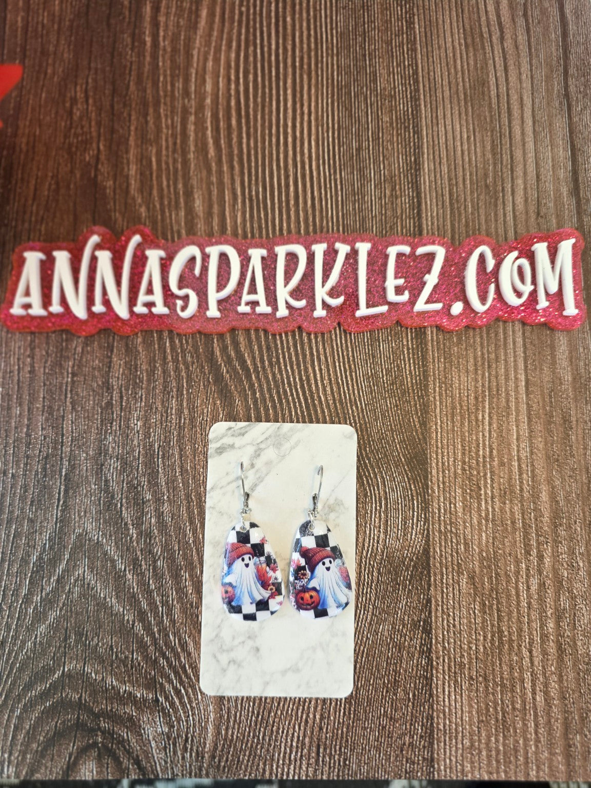 A hauntingly bold design β these long teardrop dangles feature a cozy-hat ghost, pumpkins, and a checkerboard backdrop sealed in glossy resin. With chunky silver-tone findings and a distressed vintage edge, they bring statement style thatβs equal parts spooky and chic.