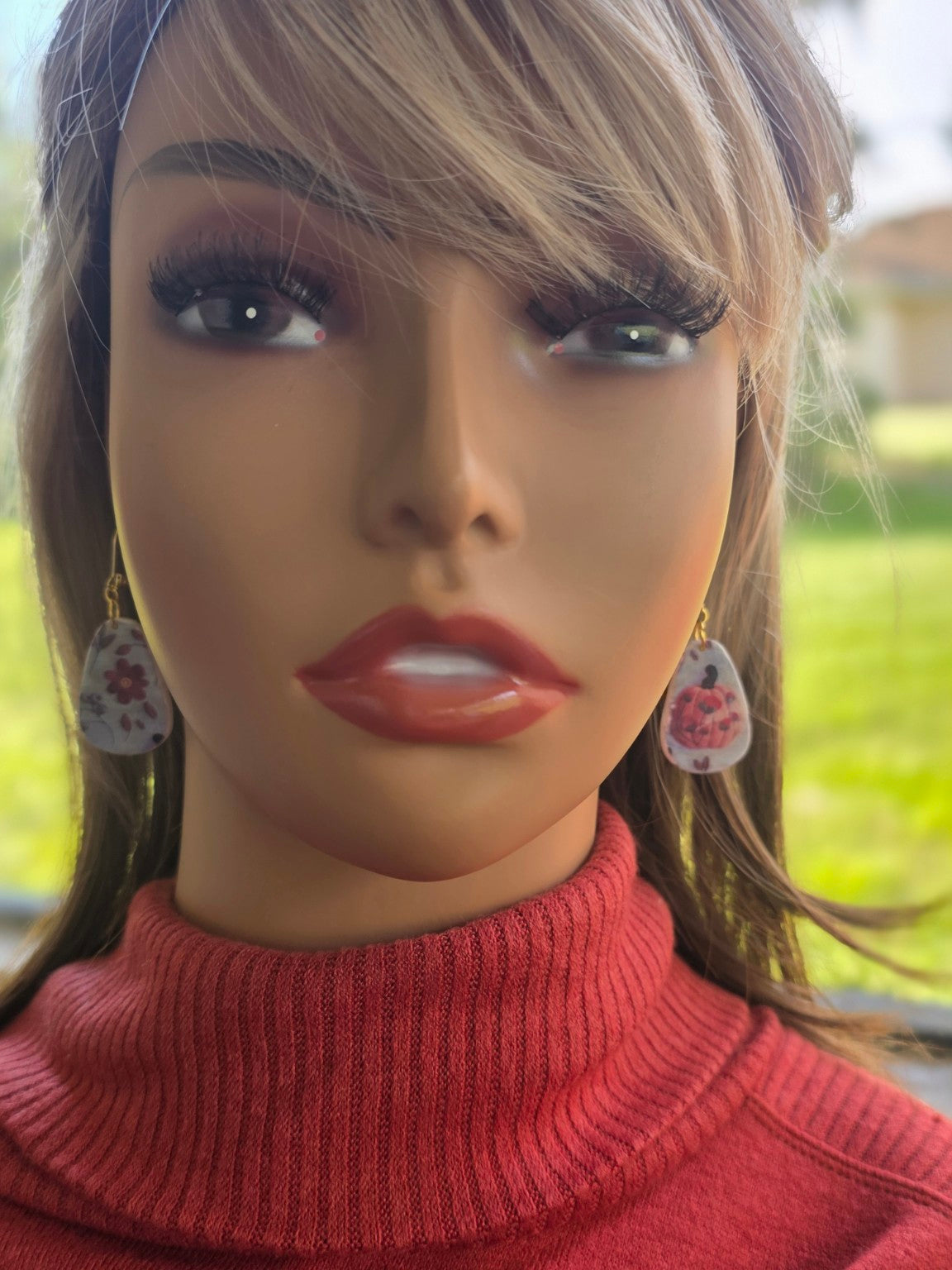 Rich crimson florals meet a warm rustic pumpkin in this striking asymmetrical pair. These chunky resin-coated teardrops offer the perfect blend of whimsy and seasonal charm, ideal for anyone who loves unique, artisan-made jewelry. 🍁✨