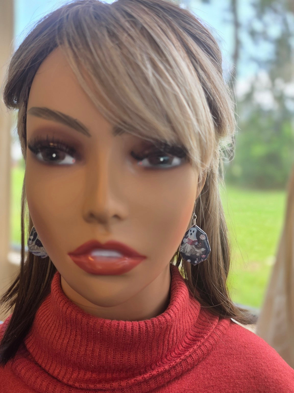 These handmade dangles feature a whimsical ghost cozied up with its favorite book, surrounded by soft florals on a midnight backdrop. Finished with a glossy resin coat, they capture a mix of haunted elegance and playful charm — a little spooky, a little bookish, and all kinds of magical.