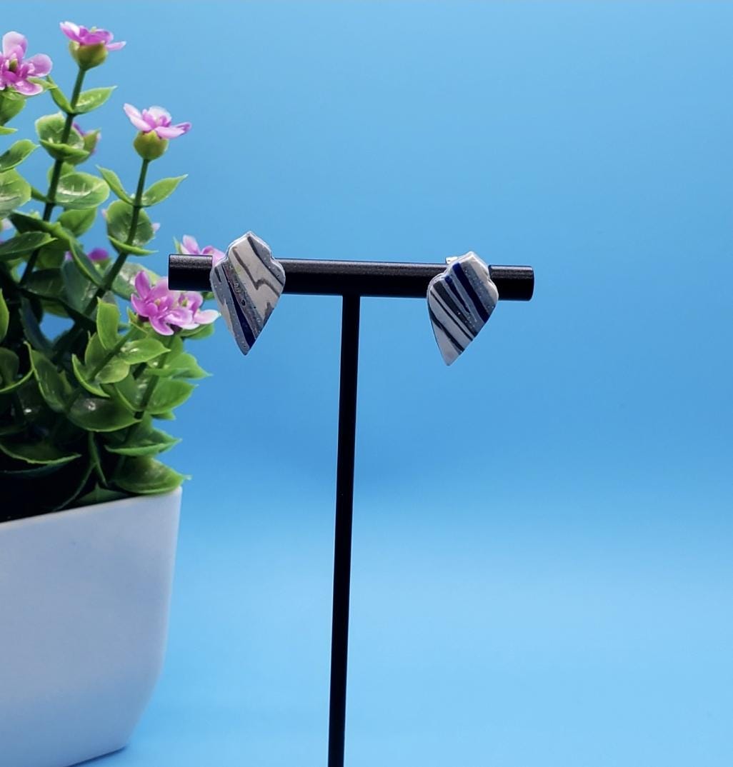 These polymer clay stud earrings are a fresh take on minimalism — featuring a geometric marbled shape with swirling navy, cobalt, and crisp white. Sculpted in an angular teardrop-meets-leaf form, they’re lightweight, edgy, and sophisticated all at once.